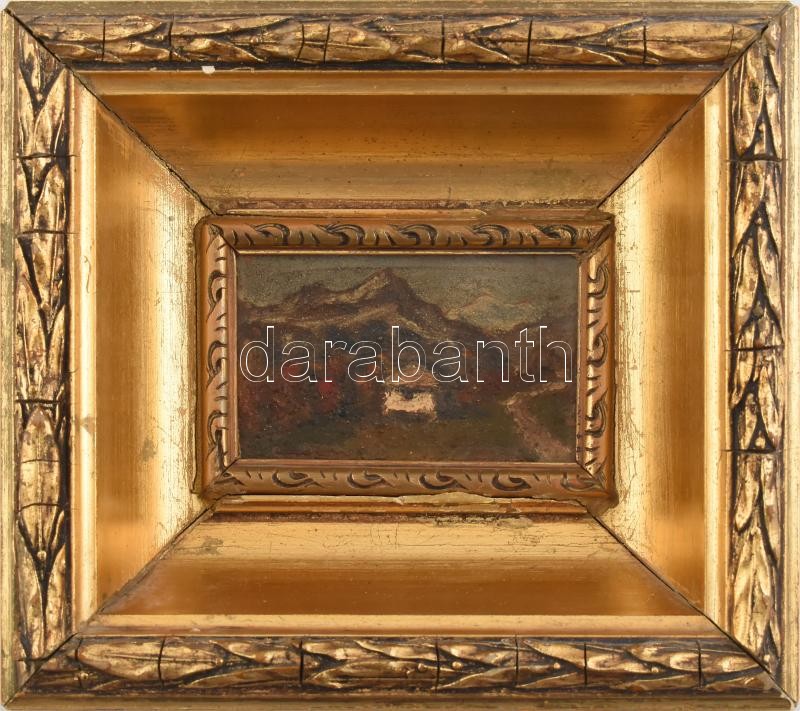 Beschreibung: Szabó Gábor (?-?): "Kis Ararát" hegy. Olaj, fa, hátoldalán címkén jelzett. Dekoratív, kissé sérült fakeretben. 6x10 cm