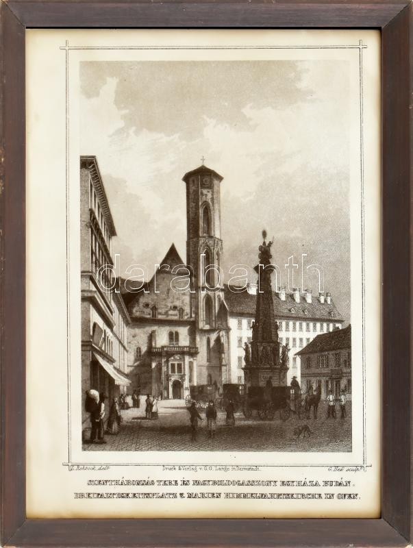 cca 1850 Ludwig Rohbock (1820-1883) - G. Hess: Szentháromság tere és Nagyboldogasszony egyháza Budán. Dreifaltigkeitsplatz und Marien Himmelfahrtskirche in Ofen. Darmstadt, G.G. Lange, , OFSZET nyomat modern , üvegezett fa keretben, 17x12,5 cm / cca 1850 Ludwig Rohbock (1820-1883) - G. Hess: Trinity Square and the Church of Our Lady of Buda, ofsett, 17x12,5 cm