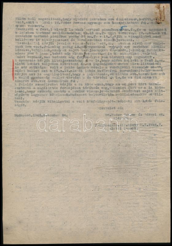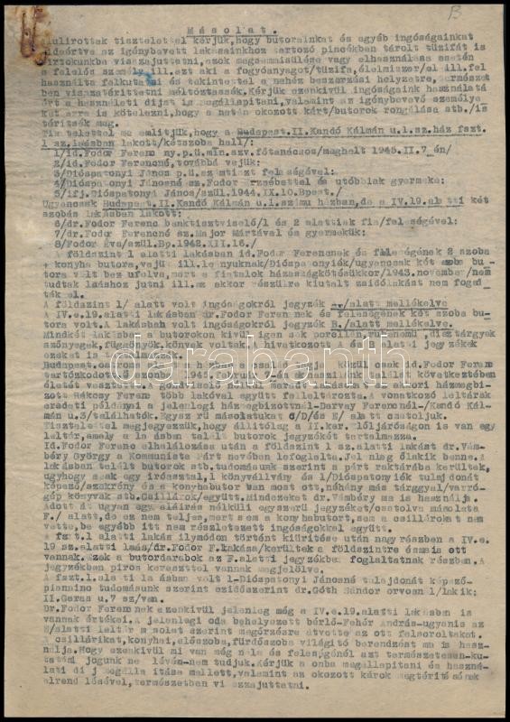 1945 Bp., Háború alatt kifosztott lakás miatti feljelentés https://www.darabanth.com/de/414-Fernauktion/414.0/Kunst-Dokumente-andere-Sammelgebiete/Dokument~500018/1945-Bp-Haboru-alatt-kifosztott-lakas-miatti-feljelentes~II2588698