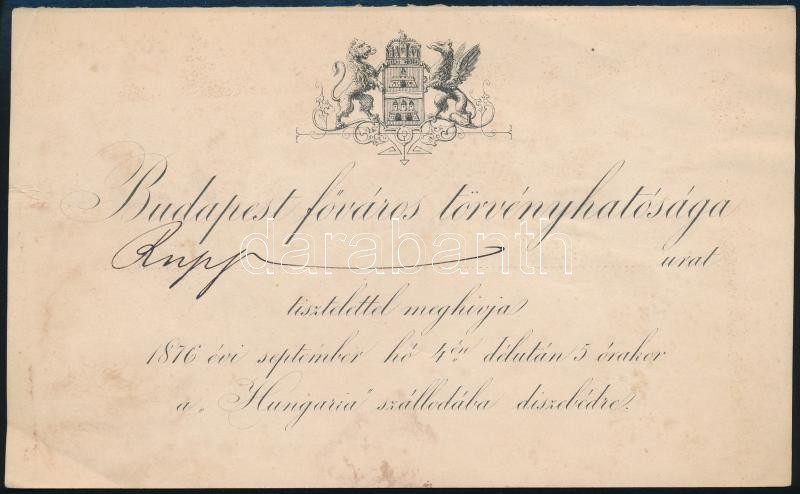1876 Budapest főváros törvényhatóságának meghívója a Hungária szállóba... https://www.darabanth.com/de/414-Fernauktion/414.0/Kunst-Dokumente-andere-Sammelgebiete/Drucksachen~1000005/1876-Budapest-fovaros-torvenyhatosaganak-meghivoja-a-Hungaria-szalloban-tartando-disze~II2562772