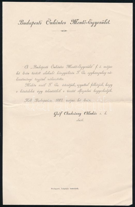 1887 Bp., A Budapesti Önkéntes Mentő-Egyesület elnökének gróf Andrássy... https://www.darabanth.com/de/414-Fernauktion/414.0/Kunst-Dokumente-andere-Sammelgebiete/Drucksachen~1000005/1887-Bp-A-Budapesti-Onkentes-Mento-Egyesulet-elnokenek-grof-Andrassy-Aladarnak-nyomtatott~II2591544