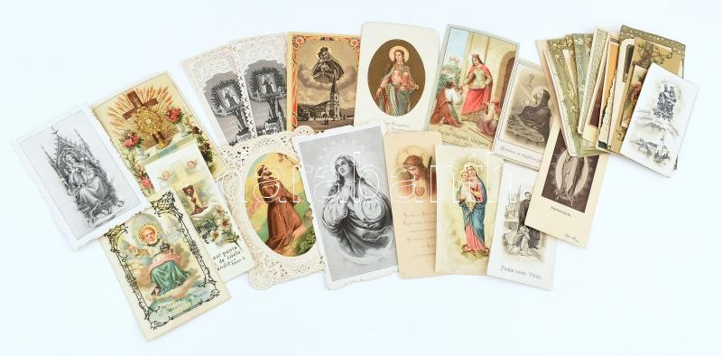 1898-1915 Vegyes szentkép tétel, közte Remete Sz. Máriás és Szent Erzsébetes is, köztük lito és csipkés is, kb. 30 db, 11x7 cm és 8x5 cm közötti méretben
