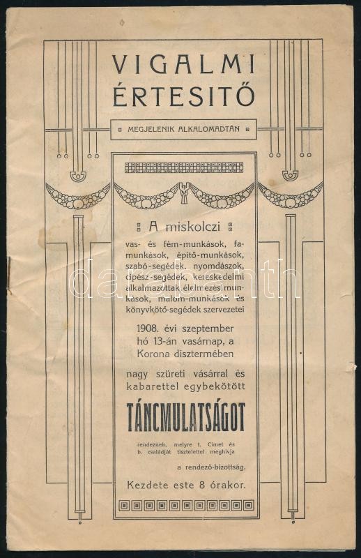 1908 Vigalmi értesítő Miskolc. Munkás táncmulatság program. 16p. https://www.darabanth.com/de/414-Fernauktion/414.0/Kunst-Dokumente-andere-Sammelgebiete/Drucksachen~1000005/1908-Vigalmi-ertesito-Miskolc-Munkas-tancmulatsag-program-16p~II2595502