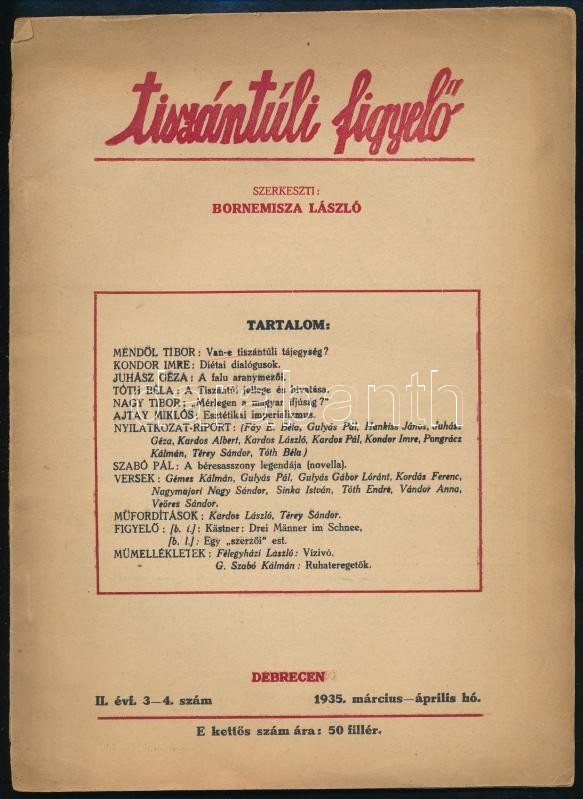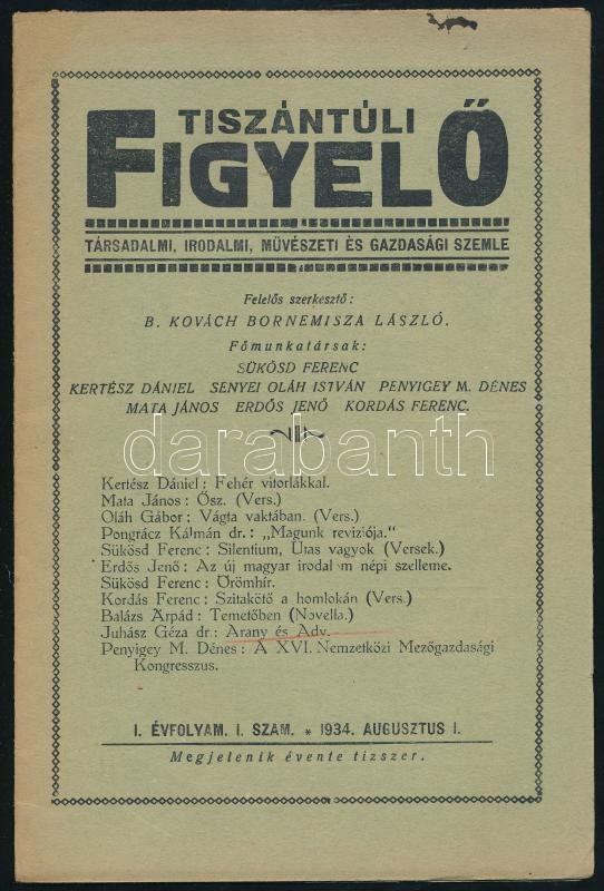 1934-1935 Tiszántúli Figyelő I. évfolyamának 1. száma és II. évfolyamá... https://www.darabanth.com/de/414-Fernauktion/414.0/Kunst-Dokumente-andere-Sammelgebiete/Drucksachen~1000005/1934-1935-Tiszantuli-Figyelo-I-evfolyamanak-1-szama-es-II-evfolyamanak-3-4-szama-2-db~II2597787