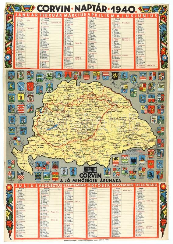 1940 "Corvin, a jó minőségek áruháza" falinaptár irredenta t... https://www.darabanth.com/de/414-Fernauktion/414.0/Kunst-Dokumente-andere-Sammelgebiete/Drucksachen~1000005/1940-Corvin-a-jo-minosegek-aruhaza-falinaptar-irredenta-terkeppel-hajtott-kis-szakadas~II2595512