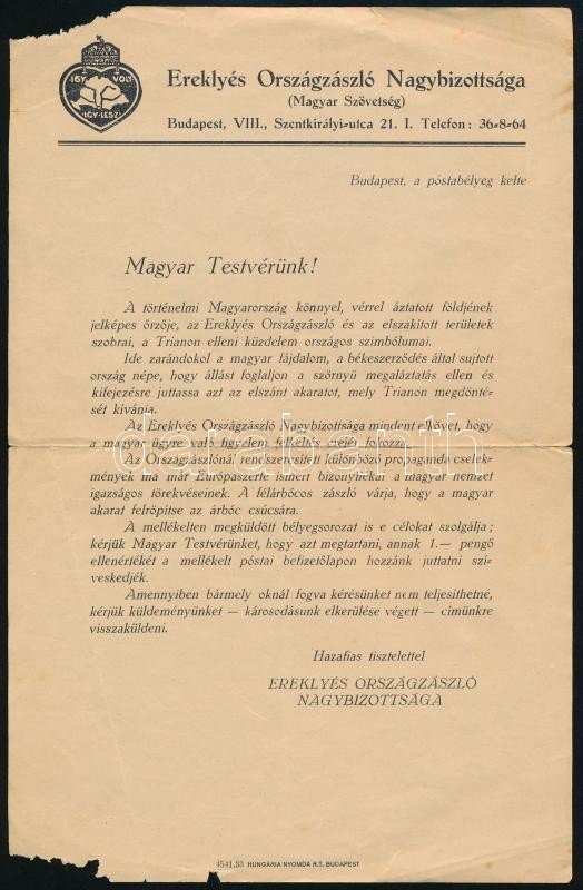 Beschreibung: cca 1930 Ereklyés Országzászló Nagybizottsága levélzáró emlékbélyeg sorozat leírása, kísérő levéllel. kis hiánnyal