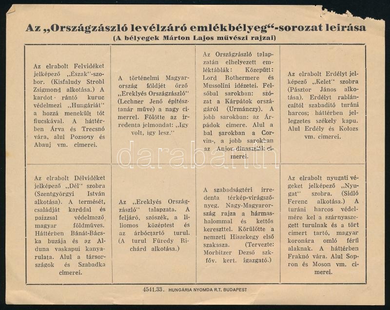 cca 1930 Ereklyés Országzászló Nagybizottsága levélzáró emlékbélyeg so... https://www.darabanth.com/de/414-Fernauktion/414.0/Kunst-Dokumente-andere-Sammelgebiete/Drucksachen~1000005/cca-1930-Ereklyes-Orszagzaszlo-Nagybizottsaga-levelzaro-emlekbelyeg-sorozat-leirasa-k~II2589823