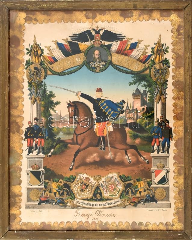 cca 1887 " Zur Erinnerung an meine Dienstzeit." Szolgálati időm emlékére, I. Ferenc József arcképével, címerekkel díszített, díszes, nagyméretű litografált emléklap, lovas katona, huszár képével a közepén, Berlin, J. Pelzer, sérült üvegezett fa keretben, 52x43 cm