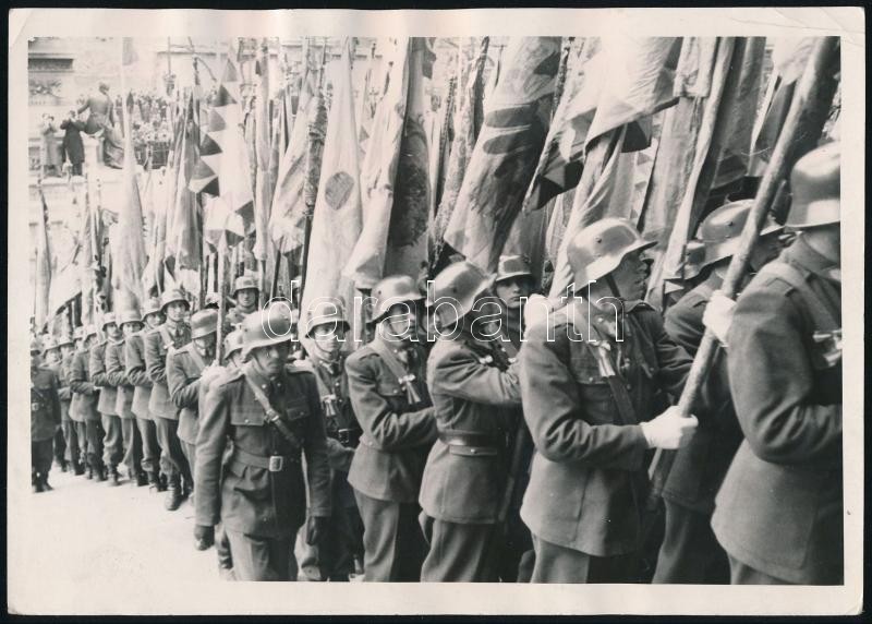 cca 1930-1940 Magyar katonák felvonulása történelmi zászlókkal, fotó, hátoldalán pecséttel jelzett (H.M. Film-Foto), sarkán kis törésnyomokkal, 18x12,5 cm