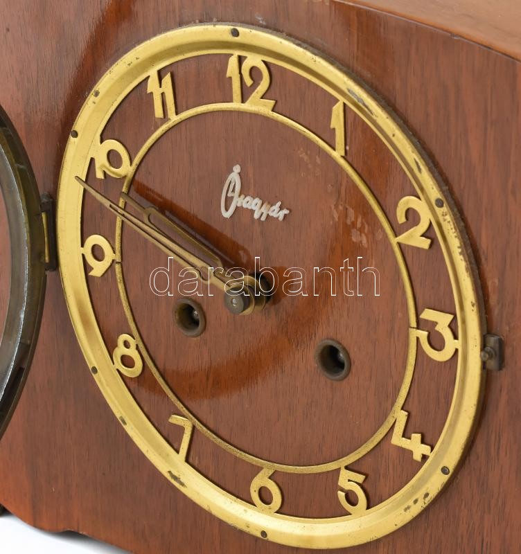 Óragyár kandallóóra. Felesütős, ingajáratos szerkezettel. Szép állapotú jelzett fa tokban, számlapon kis sérüléssel. Működő, jó állapotban, kulcssal 27x25 cm