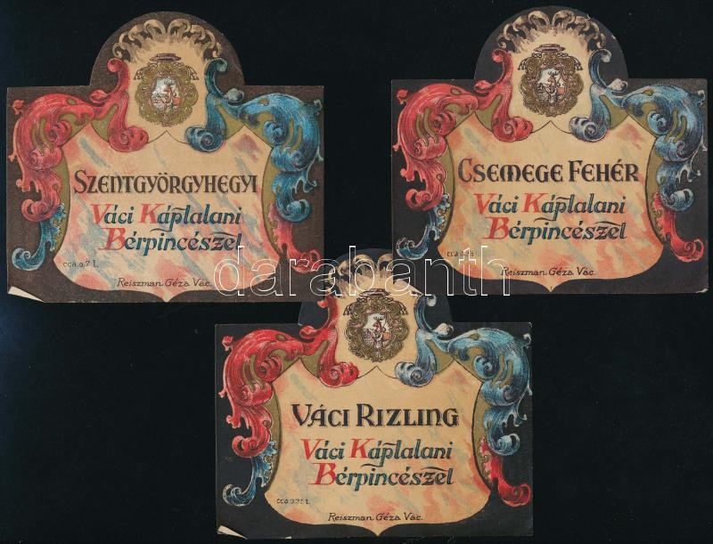 Beschreibung: cca 1920-1940 Vác, Reiszman Géza, Váci Káptalani Bérpincészet, 3 db különféle, díszes régi borcímke