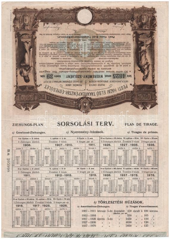 Budapest 1906. "Pesti Hazai Első Takarékpénztár-Egyesület" 1... https://www.darabanth.com/de/414-Fernauktion/414.0/Numismatik/Aktien-und-Tickets~2000004/Budapest-1906-Pesti-Hazai-Elso-Takarekpenztar-Egyesulet-100K-rol-szolo-nyeremenykotven~II2581265