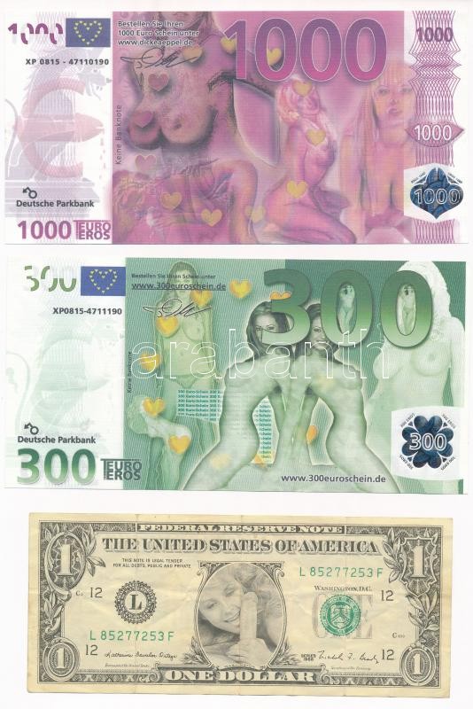 Németország DN 300E + 1000E erotikus fantázia bankjegy + Amerikai Egyesült Államok DN 1$ pornó bankjegy T:I Germany ND 300 Euro + 1000 Euro erotic fantasy banknote + USA ND 1 Dollar porn banknote C:UNC