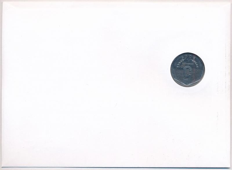 Costa Rica 1989. 5 Colones steel in envelope with stamp, cancellation and a prospectus in german C:AU patina, small scratches