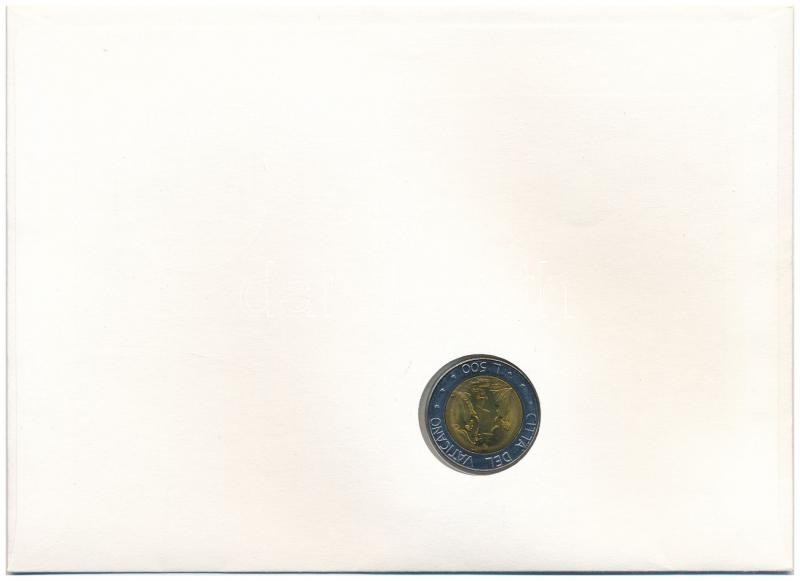 Vatikán 1990. 500L bimetál "II. János Pál" felbélyegzett borítékban, bélyegzéssel, német nyelvű tájékoztatóval T:1 Vatican City 1990. 500 Lire bimetallic "John Paul II" in envelope with stamp, cancellation and a prospectus in german C:UNC
