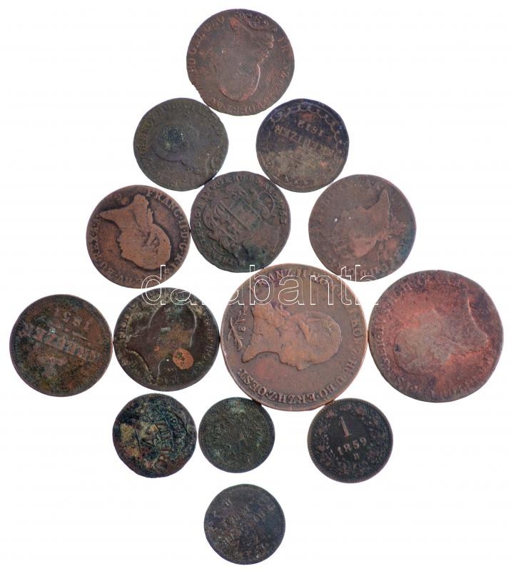Beschreibung: 1763. Rézdénár "Mária Terézia / zárt korona" + 1782B 1/4kr Cu "II. József" + 1800B 1kr Cu "I. Ferenc" (2x) + 1800G 1kr Cu "I. Ferenc" + 1800E 3kr Cu "I. Ferenc" + 1800S 6kr Cu "I. Ferenc" + 1812S 1/2kr Cu "I. Ferenc" (2x) + 1812S 1kr Cu "I. Ferenc" + 1816O 1/4kr Cu + 1851B 1kr Cu + 1858B 5/10kr Cu + 1859B 1kr Cu T:2-,3