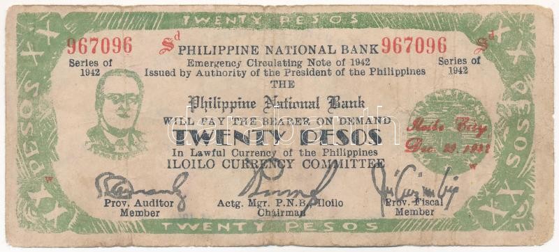 Beschreibung: Fülöp-szigetek 1942. 20P "967096" T:III kis anyaghiány, szakadások, folt