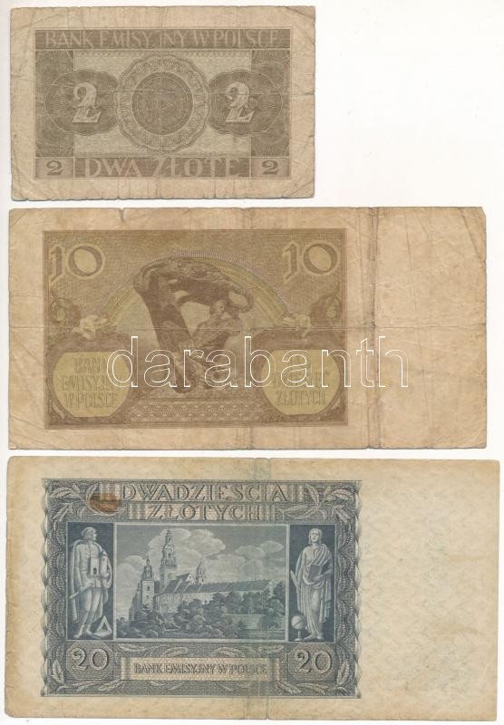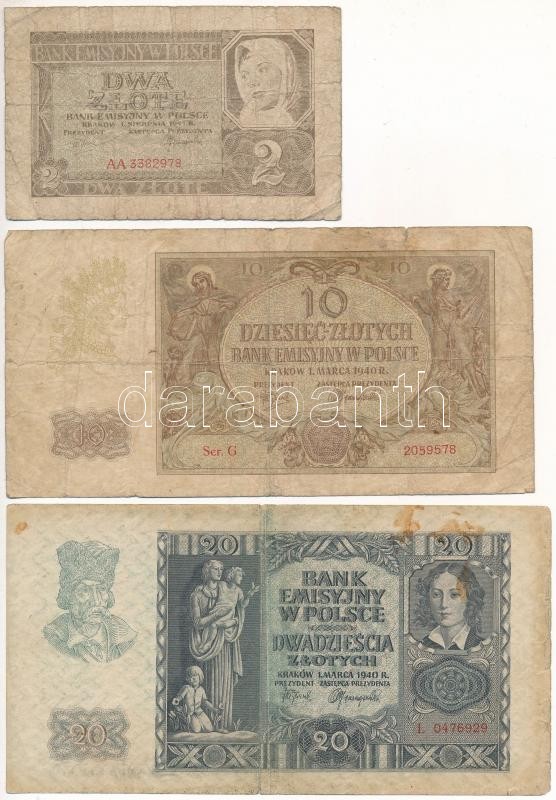 Lengyelország / Német megszállás 1940. 10Zl + 20Zl + 1941. 2ZL T:III-,... https://www.darabanth.com/de/414-Fernauktion/414.0/Numismatik/Weltweit-Banknoten~2000012/Lengyelorszag-Nemet-megszallas-1940-10Zl-plus-20Zl-plus-1941-2ZL-TIII-IV-Poland-German-occupa~II2590877