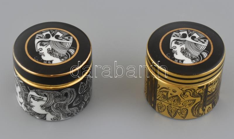 Beschreibung: Hollóházi Szász Endre által tervezett mintával díszített tégely 2db, nem hozzá illő tetőkkel, matricás, kopásnyomokkal, jelzett, 5,5x6 cm