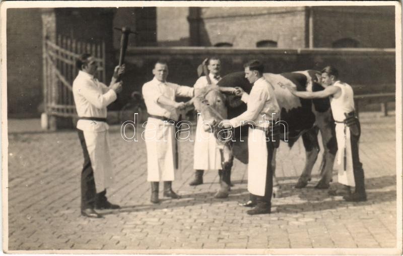 Böllérek a vágóhídon / butchers at the slaughterhouse. photo https://www.darabanth.com/de/415-Fernauktion/415.0/Ansichtskarten/Berufe-Uniformen~1000054/Bollerek-a-vagohidon-butchers-at-the-slaughterhouse-photo~II2512085