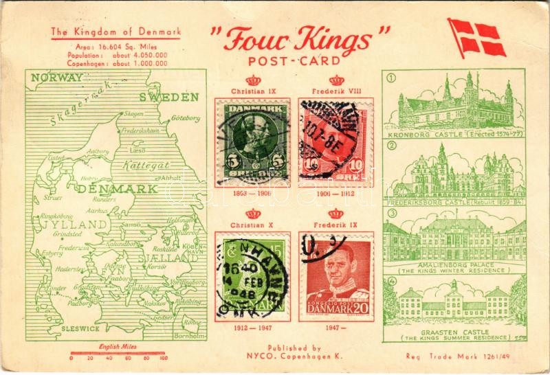 1954 The Kingdom of Denmark. "Four Kings" Postcard Christian IX, Frederik VIII, Christian X, Frederik IX. Kronborg Castle, Frederiksborg Castle, Amalienborg Palace, Graasten Castle, Danish flag, map (EK)