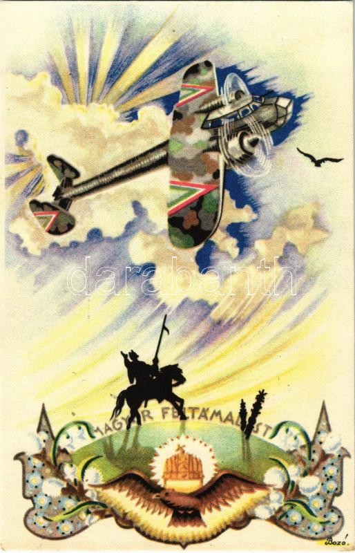 Beschreibung: Magyar feltámadást! / Hungarian irredenta propaganda art postcard, military aircraft s: Bozó