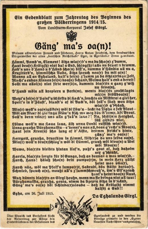 1915 Ein Gedenkblatt zum Jahrestag des Beginnes des großen Völkerringe... https://www.darabanth.com/de/415-Fernauktion/415.0/Ansichtskarten/Militaria~1000067/1915-Ein-Gedenkblatt-zum-Jahrestag-des-Beginnes-des-groC39Fen-Volkerringens-1914-15-WWI-Austro-Hun~II2600406