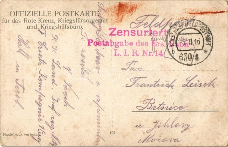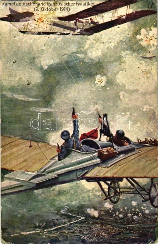1916 Kampf deutscher und französischer Aviatiker (9. Oktober 1914) / WWI Austro-Hungarian K.u.K. military art postcard, battle between German and French aviators. Offizielle Postkarte für das Rote Kreuz, Kriegsfürsorgeamt und Kriegshilfsbüro 107. + "Postabgabe des Ers. Baon L.I.R. Nr. 14." (EK)