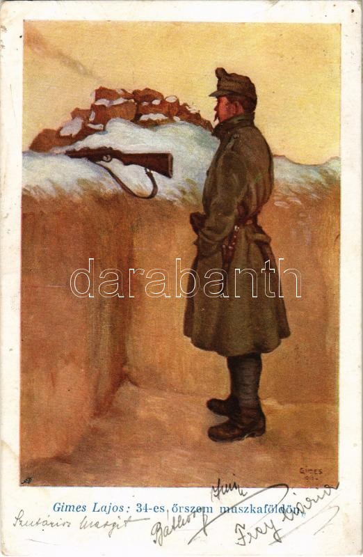 Beschreibung: 1917 34-es őrszem Muszkaföldön / WWI Austro-Hungarian K.u.K. military art postcard, watchman s: Gimes Lajos főhadnagy (kis szakadás / small tear)