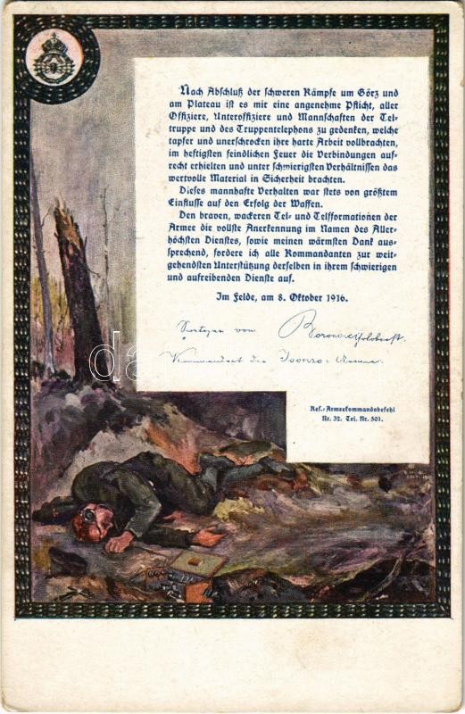 Beschreibung: Das Reinerträgnis fließt dem Witwen- und Waisenfond des Tel. Regts. zu / WWI Austro-Hungarian K.u.K. military art postcard, dead field telegrapher (EK)