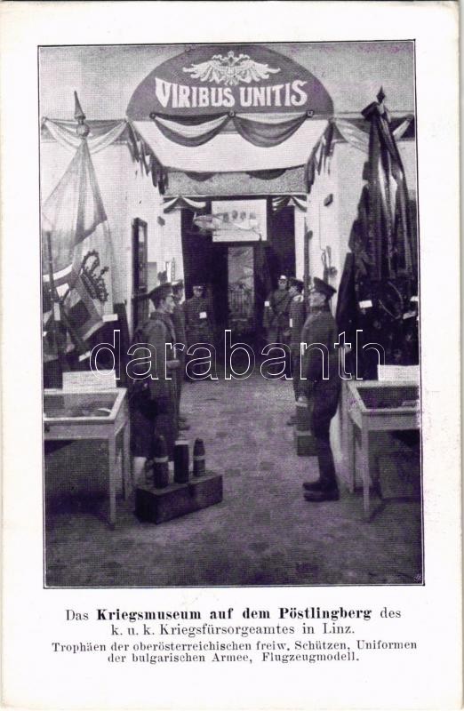 Der Kriegsmuseum auf dem Pöstlingberg des k.u.k. Kriegsfürsorgeamtes in Linz. Trophäen der oberösterreichischen freiw. Schützen, Uniformen der bulgarischen Armee, Flugzeugmodell / WWI Austro-Hungarian K.u.K. military, War Museum in Linz, Viribus Unitis (EK)