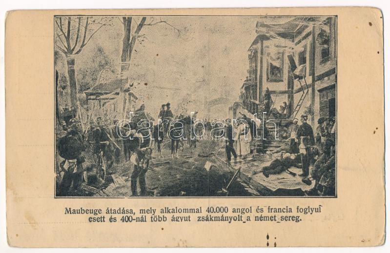 Maubeuge átadása, mely alkalommal 40000 angol és francia foglyul esett és 400-nál több ágyút zsákmányolt a német sereg / WWI German military art postcard, Siege of Maubeuge (EK)
