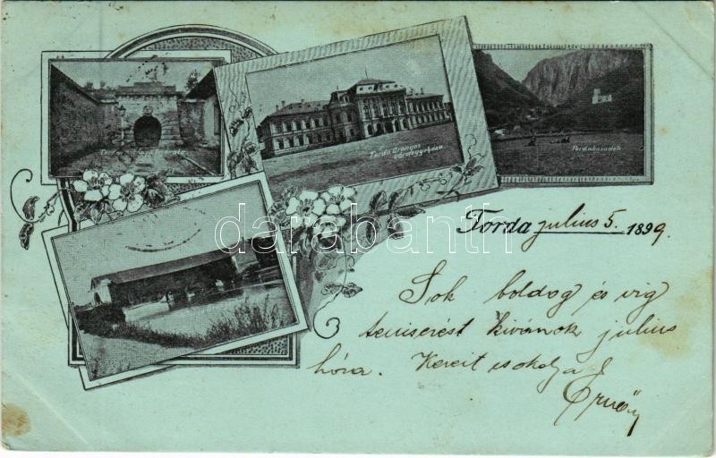 Beschreibung: 1899 (Vorläufer) Torda, Turda; Torda-Aranyos vármegyeháza, sóbánya bejárata, híd, Tordai hasadék / Turda-Aries county hall, salt mine, bridge, gorge. Art Nouveau, floral (fl)
