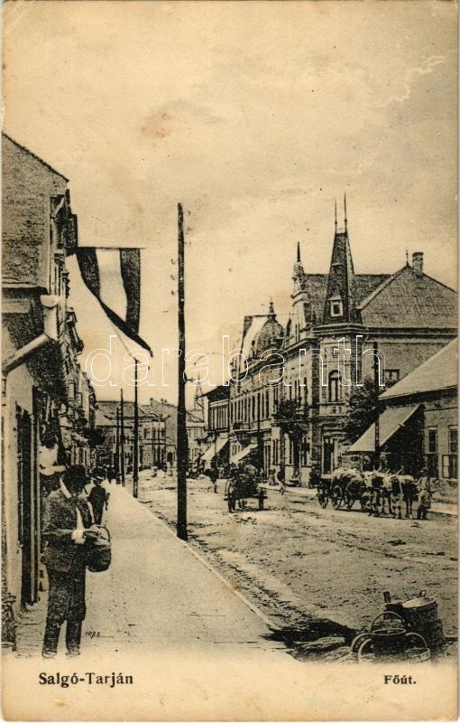 1912 Salgótarján, Főút, magyar zászló. Friedler Ármin kiadása (EK) https://www.darabanth.com/de/415-Fernauktion/415.0/Ansichtskarten/Ungarn~1000005/1912-Salgotarjan-Fout-magyar-zaszlo-Friedler-Armin-kiadasa-EK~II2603430