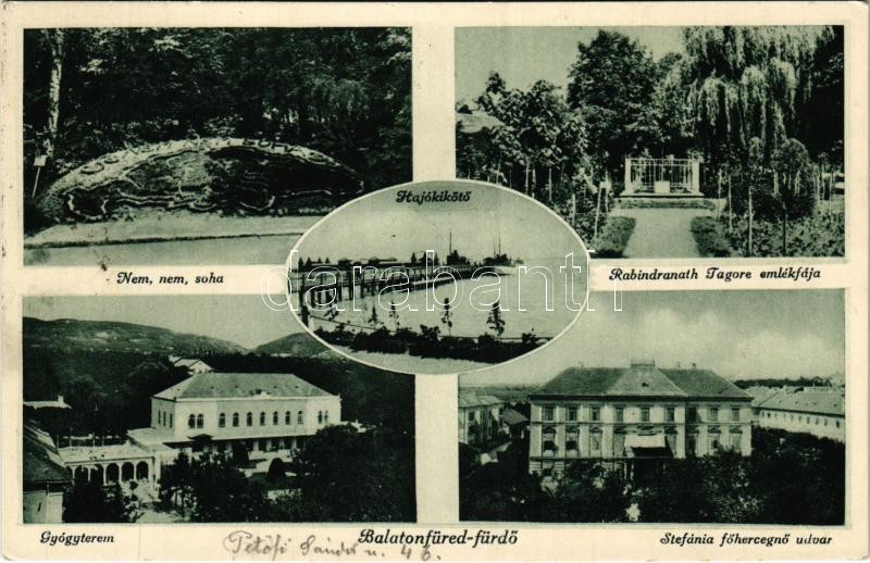 Beschreibung: 1937 Balatonfüred, Hajókikötő, "Nem, nem, soha!" irredenta emlékmű, Rabindranath Tagore emlékfája, Gyógyterem, Stefánia főhercegnő udvar