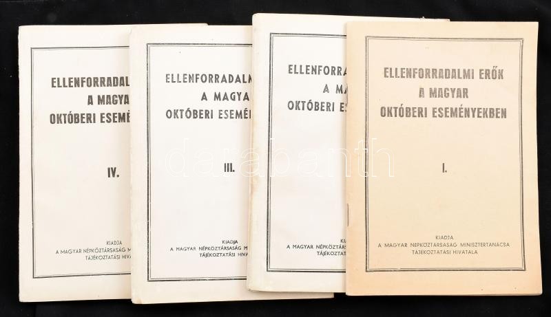 Ellenforradalmi erők a magyar októberi eseményekben I-IV. köt. Bp., én., Magyar Népköztársaság Minisztertanácsa Tájékoztatási Hivatala. Fekete-fehér fotókkal illusztrált. Kiadói papírkötés.