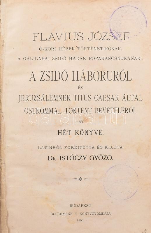 Josephus Flavius: Flavius József ó-kori héber történetirónak, a galileai zsidó hadak főparancsnokának, a zsidó háboruról és Jeruzsálemnek Titus caesar által ostrommal történt bevételéről irt hét könyve. Latinból forditotta és kiadta Dr. Istóczy Győző. Bp., 1900., Buschmann F., IV+503 p. Átkötött kopott félvászon-kötés, intézményi bélyegzőkkel, névbejegyzésekkel, kissé foltos lapokkal.
