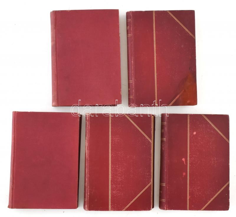 Az Izraelita Magyar Irodalmi Társulat évkönyvei 5 kötet, 1906, 1907, 1908, 1909., 1910. Szerk.: Bánóczi József. Bp., 1906-1910.,Izraelita Magyar Irodalmi Társulat, 394; 407; 450; 454; 440 p. Átkötött egészvászon-kötések, és kiadói egészvászon-kötések, kopott borítókkal, foltos lapokkal, "Kispesti Izraelita Ifjúsági Egyesület" egykorú bélyegzéseivel.