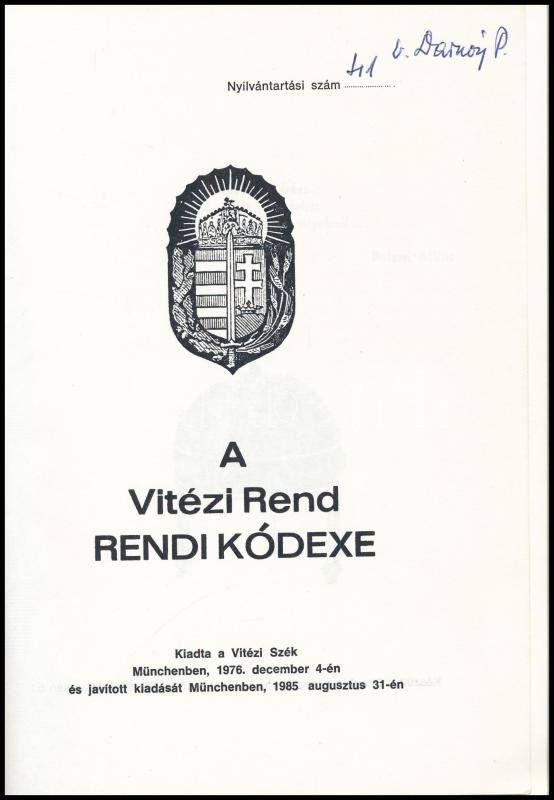1985 A Vitézi rend rendi kódexe. névre szóló példány. 96p Kiadói papír... https://www.darabanth.com/de/415-Fernauktion/415.0/Bucher/Bucher-Militaria~1500010/1985-A-Vitezi-rend-rendi-kodexe-nevre-szolo-peldany-96p-Kiadoi-papirkotesben~II2607037