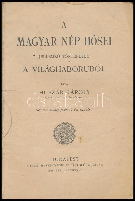 Huszár Károly: A magyar nép hősei. Jellemző történetek a világháborúból. Nemess Mihály rajzaival. Bp.,1915., Szent István-Társulat. Fekete-fehér szövegközti és egészoldalas illusztrációkkal. Kiadói illusztrált papírkötés, szakadt borítóval, az elülső borító levált.