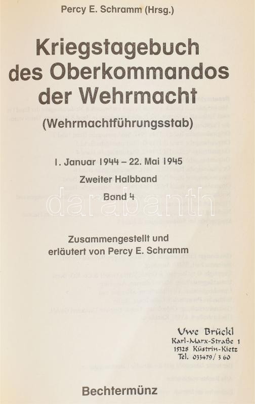 Beschreibung: Kriegstagebuch des Oberkommandos der Wehrmacht (OKW.) Wehrmachtführungsstab. I-VIII. Bände. I-II Bände: 1940-1941. III-IV. Bände: 1942. V-VI. Bände: 1943. VII-VIII. Bände: 1944-1945. Hrsg.: Percy E. Schramm. [Augsburg], 2005, Bechtermünz. Német nyelven. Kiadói papírkötések.