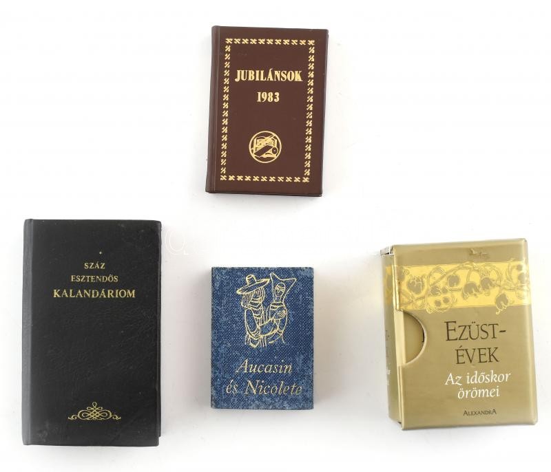 Beschreibung: Aucasin és Nicolete. Ófrancia széphistória. Fordította Tóth Árpád. Illusztrálta Engel Tevan István. Bp., 1972, Európa könyvkiadó. Kiadói aranyozott egészvászon kötés. Megjelent 1850 példányban. / Jubilánsok 1983. Budapest, 1982, Kiadói egészvászon-kötés. / Száz esztendős kalandáriom (minikönyv) Reprint kiadás. Kiadói kartonált műbőr kötés. / Helen Exley: Ezüstévek (minikönyv). 2006. Pécs, Alexandra Kiadó. Ragasztott kemény papírkötés. Eredeti papír védődobozban.