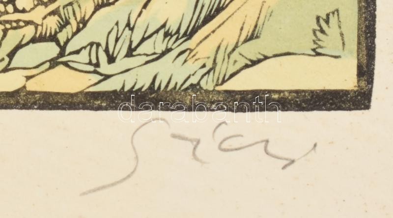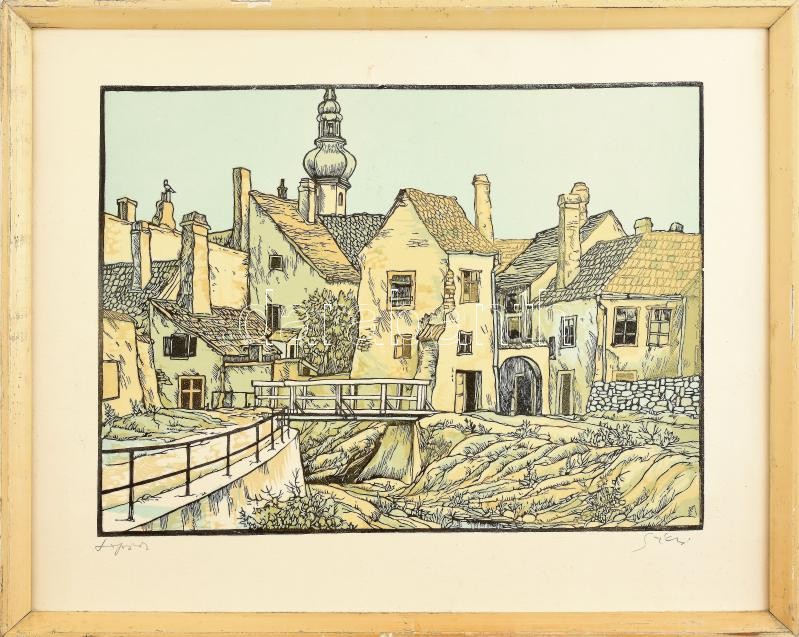 Beschreibung: Gácsi Mihály (1926-1987): Sopron. Színes linómetszet, papír, jelzett. Kissé kopott fakeretben, 30×40 cm
