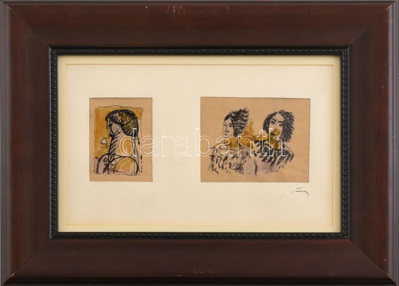 Beschreibung: Hincz Gyula (1904-1986): Alakok. Filctoll, papír, jelzett a paszpartun. Dekoratív, üvegezett, kissé kopott fakeretben, 9×6 és 9x11 cm