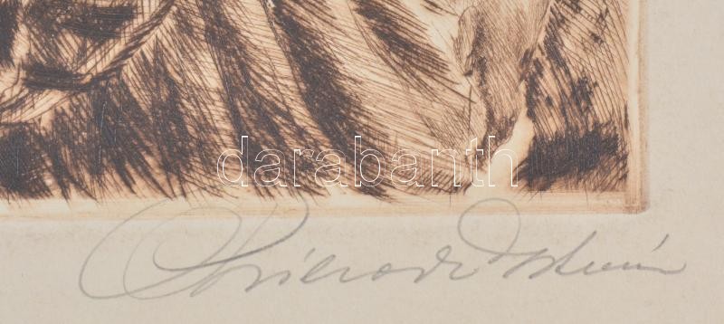 Beschreibung: Prihoda István (1891-1956): Lány virágkosárral. Rézkarc, papír, jelzett. Lap széle kissé sérült. 25x19,5 cm