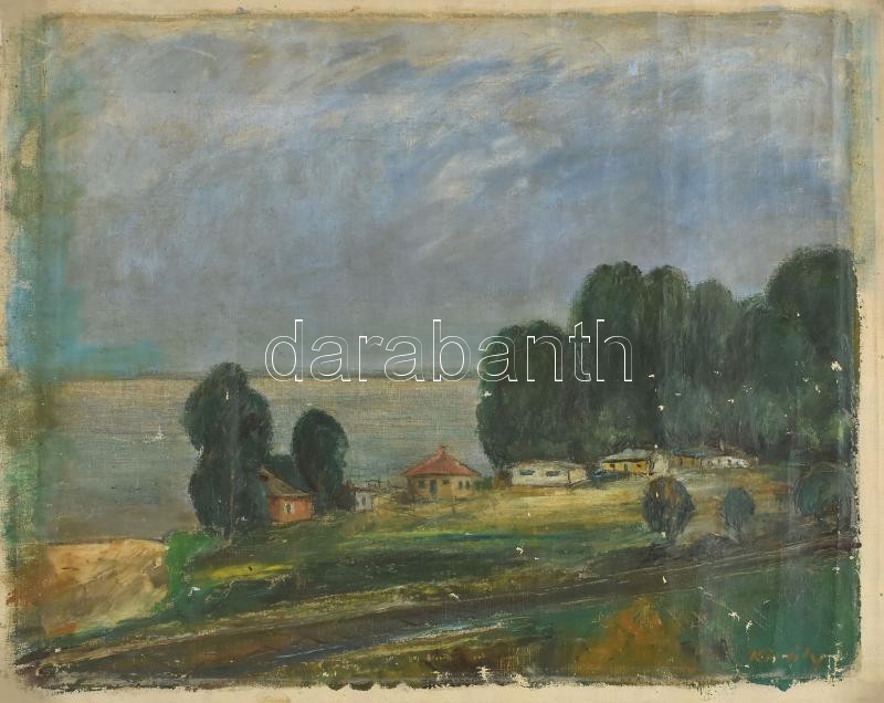Beschreibung: Király jelzéssel: Vízparti táj. Olaj, vászon. Feltekerve, sérült. 51x62 cm