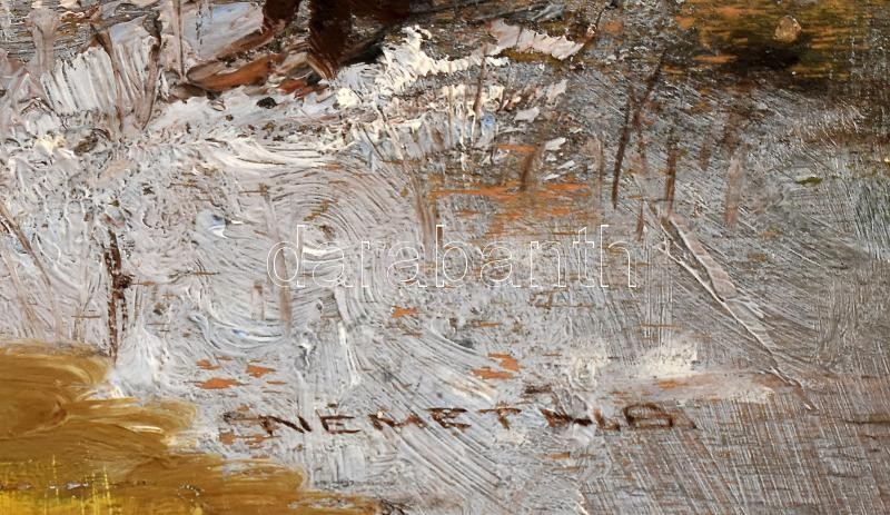 Beschreibung: Németh B. jelzéssel: Havas erdő. Olaj, fa, keret nélkül, 19,5x29,5cm