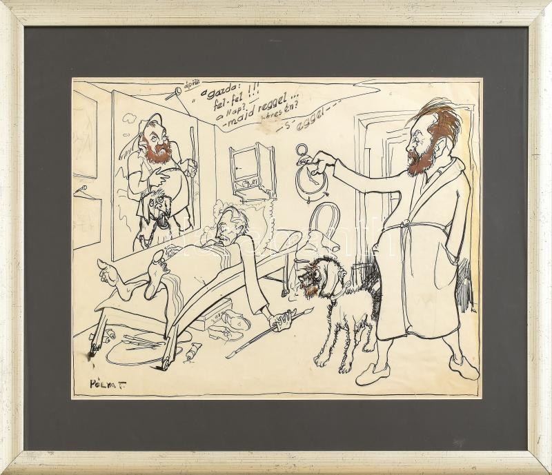 Beschreibung: Pólya T jelzéssel: Karikatúra. Vegyes technika, papír, kissé sérült és foltos. 29x41 cm, üvegezett fa keretben