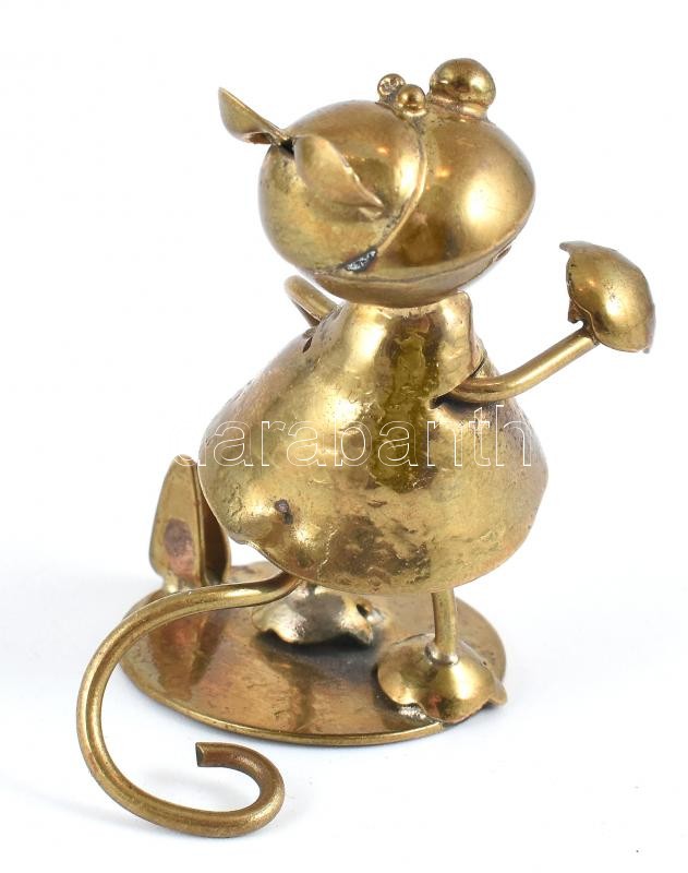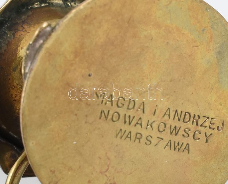 Mid-Century Figurative Art by Andrzej Nowakowscy (1938 - 2008): Egér / Mysz, névjegy tartó, örvösművészeti réz. Jelzett: Magda i Andreze Nowakowscy. m:5cm. Andrzej Jerzy Nowakowski Warszawa / Varsó. 1938. október 2-án született Lublinban. Miután Varsóba költözött, ahol befejezte az általános iskolát. Még annak befejezése előtt sikeres felvételi vizsgát tett a varsói Állami Képzőművészeti Középiskolába, ahol négy évig (1953-1957) tanult, és nagyon jó jegyeket kapott művészeti tárgyakból - rajz, festészet, szobrászat -. Az 1957-1966-os években kizárólag a művészeti munkának szentelte magát - akvarelleket és olajfestményeket festett, valamint vázlatokat és karikatúrákat rajzolt. Ebben az időszakban "fedezte fel" a művészi fémművességet, amely szerelme és szenvedélye lett, amely egész életében kitartott. Először fémből készítette első munkáit: ékszereket (karkötőket, gyűrűket, brossokat és nyakláncokat), és - ami egész életművének védjegyévé vált - egyedi figurákat. / Andrzej Jerzy Nowakowski urodził się 2 października 1938 roku w Lublinie. Po przeprowadzeniu się do Warszawy, gdzie ukończył szkołę podstawową. Jeszcze przed jej ukończeniem zdał egzamin wstępny do Państwowego Liceum Sztuk Plastycznych w Warszawie, gdzie uczył się cztery lata (1953-1957), mając bardzo wysokie oceny z przedmiotów artystycznych - rysunek, malarstwo, rzeźba. W latach 1957-1966 poświęcił się wyłącznie twórczości artystycznej - malował akwarele i obrazy olejne oraz rysował szkice i komiksy. W tym okresie ,,odkrył" metaloplastykę artystyczną, która stała się jego miłością i pasją trwającą do końca życia. Najpierw tworzył pierwsze dzieła w metalu: biżuterię (bransolety, pierścionki, broszki i naszyjniki) oraz, co stało się znakiem rozpoznawczym Jego całej twórczości - niepowtarzalne figurki.