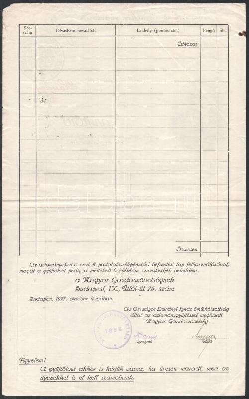 Beschreibung: 1927 Bp., gyűjtőív Darányi Ignác emlékének szoborral való megörökítésére, a Magyar Gazdaszövetség pecsétjével, aláírásokkal (egyébként kitöltetlen)